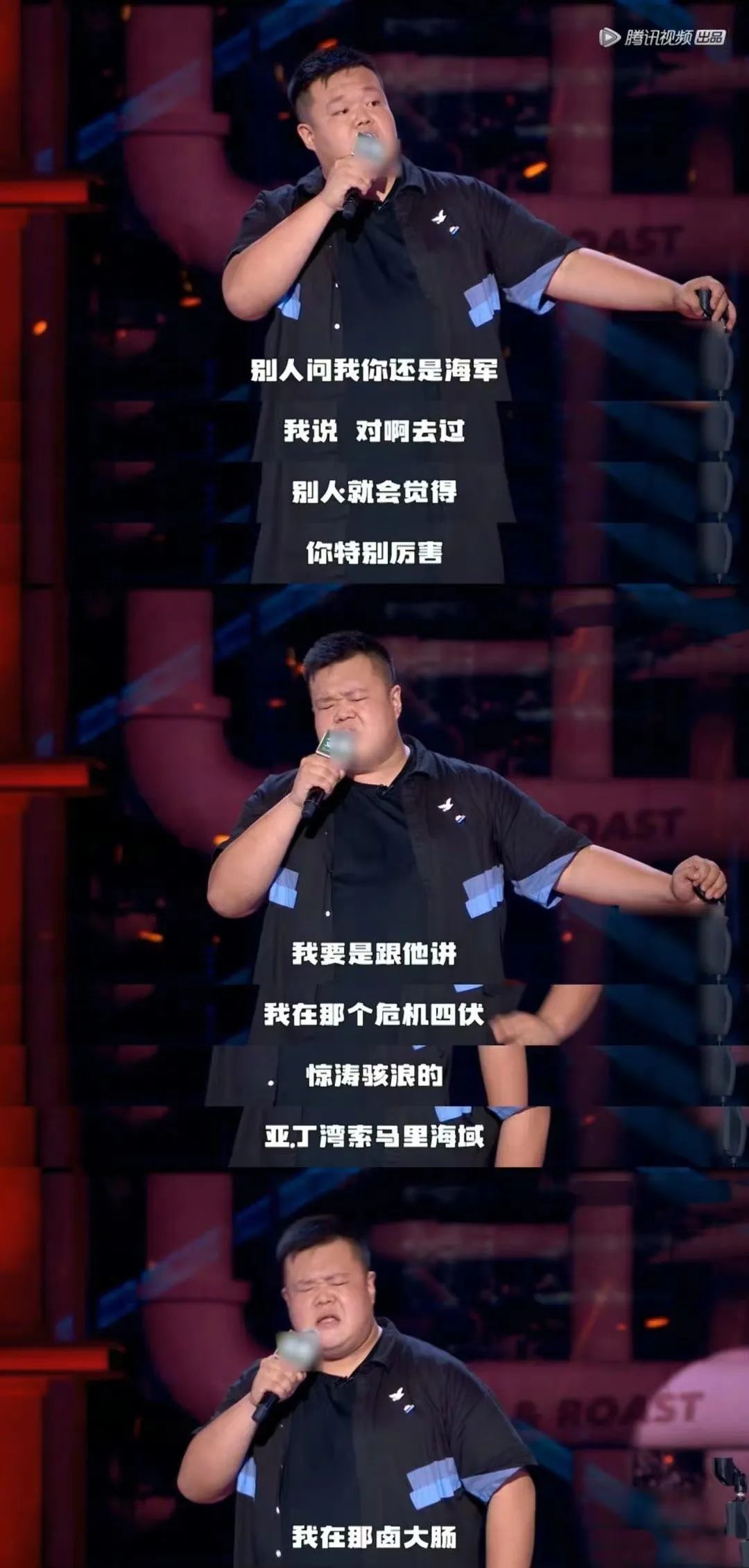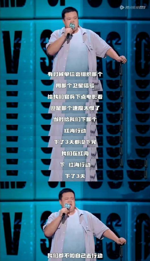 节目里,毛豆拿手帕擦着汗,用大连话讲述自己成为炊事兵、参与亚丁湾护航的经历:
