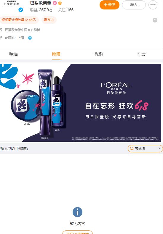 据猫眼专业版显示,蔡徐坤涉及的商务代言有42个。今日,在汰渍、雀巢中国、vivo、巴黎欧莱雅等与蔡徐坤此前有过合作的品牌官微内搜索他的名字,都显示暂无内容。