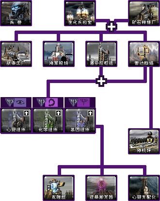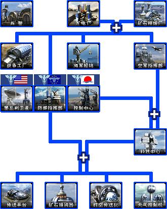 讲t2之前,我要先简单说一下科技树,各个阵营都是电矿解锁重工和t2,各大阵营t2不同。我一般把解锁mcv(mobile construction centre,基地车)的叫t2,剩余的同级建筑即t2.5。t2有四个使命,解锁小地图,mcv,子阵营t2专属载具和高科(t3)。盟军t2机场,解锁小地图和mcv。t2.5,美国墨丘利卫星上线中心,欧洲联盟防御指挥部,太平洋阵线机器人控制中心,任意一者解锁子阵营专属t2载具,机场+任意t2.5者解锁高科。