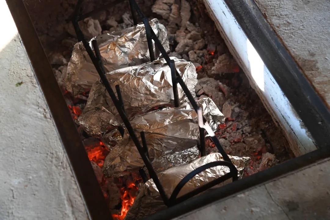 2.在开窑前,先把燃料烧到黑里透红的状态,再将烧透的燃料倒入窑中。为了使烧出来的鸡带有果木的香气,店家特地精选了荔枝木炭作为燃料;