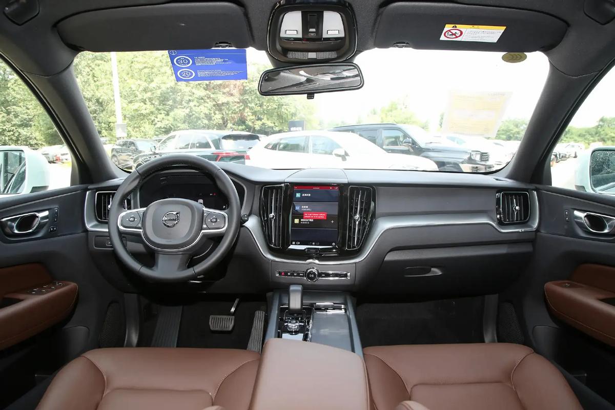 内饰设计,车辆采用略带偏转的中控布局,金属装饰为装饰面板增加了起伏层次,并布局纵向出风口。三辐式方向盘前端为12.3英寸液晶仪表盘,而中控则为纵置9.0英寸触控屏,并由英特尔凌动芯片支持安卓智能车机系统,支持CarPlay、语音交互、手机APP远程车控等功能。同时,XC60的门板、方向盘、座椅等区域均带有软包,其中,方向盘为真皮、座椅为仿皮,后者支持前排10向电动调节,并可选双排加热功能。