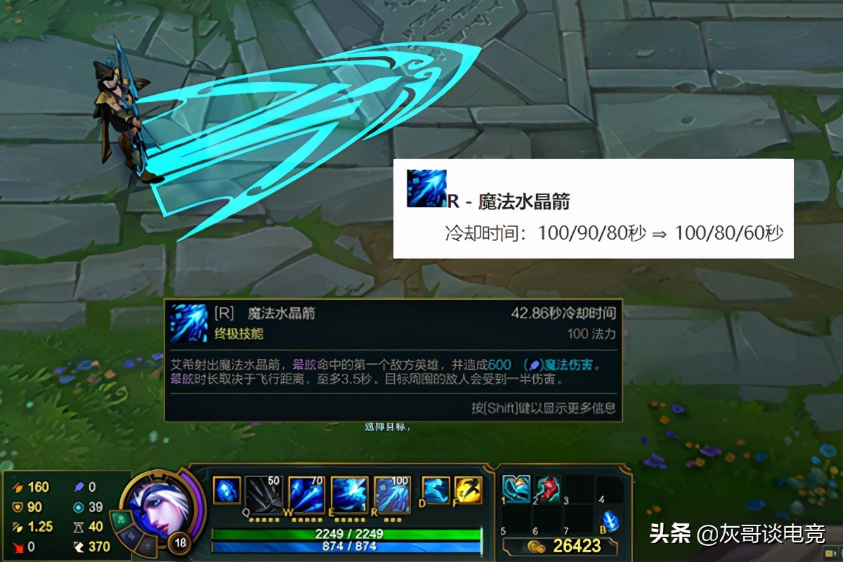 众所周知艾希的定位是一个“工具人ADC”,相较于其他ADC她最大的优势就是开团能力,而在11.7版本中,设计师又对她的开团能力进行了一番加强,大招冷却时间从原来的100/90/80秒调整为100/80/60秒,如果按照传统暴击流来出装的话,艾希是没有任何技能急速的,但出了挺进破坏者搭配CD鞋的话就会有40技能急速,可以让艾希更加频繁地释放E技能与大招,算是变相提升了她的工具人属性。