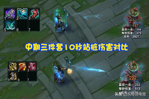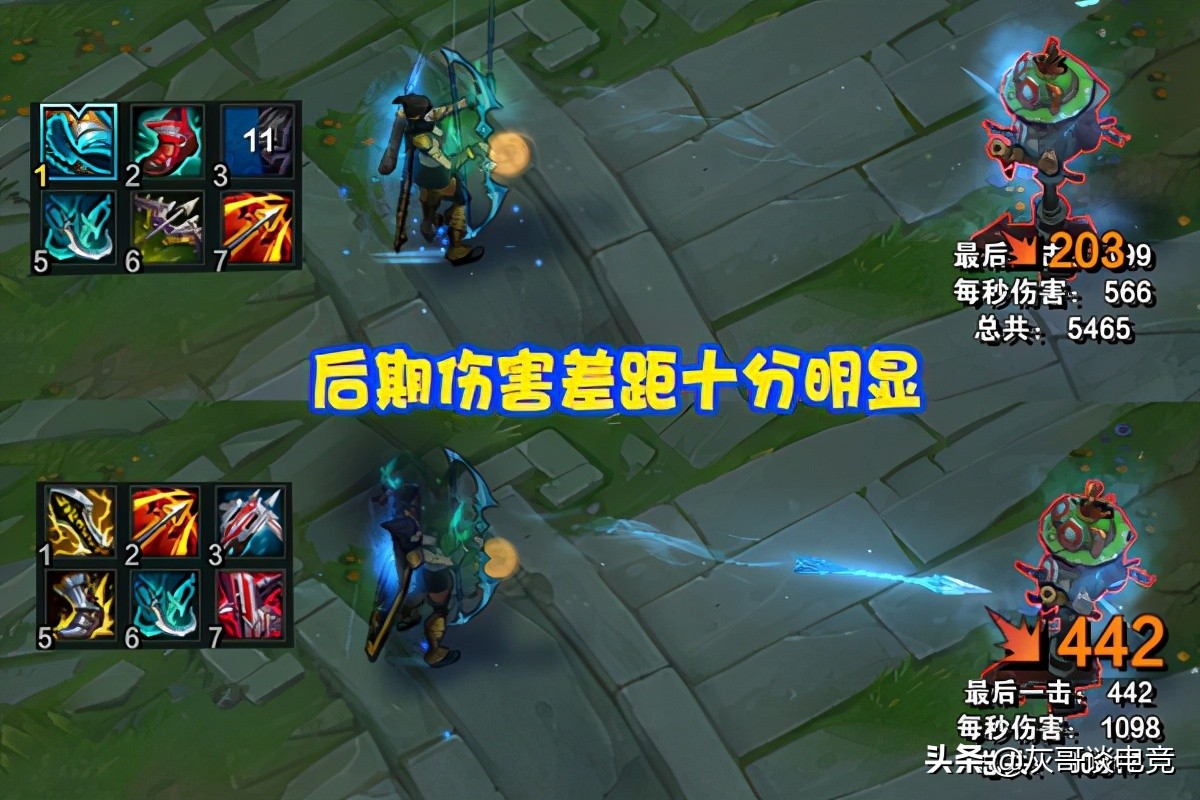 接下来说说大家最关心的伤害问题,究竟挺进流艾希与传统暴击流艾希的差距有多少?灰哥做了多次木桩测试,首先将假人的双抗调至100,血量调至2500(让破败的附加伤害和实战状态差不多),接着不用任何技能让艾师傅对其进行10秒的“按摩”,挺进流三件套与六神装所打出的伤害在3600和5500左右,而暴击流三件套与六神装所打出的伤害则为4800和11000左右,根据数据来看两套装备在中期的差距不是太大,越到后期暴击流的优势越明显。当然,这仅仅是站桩测试,实战中挺进流的输出环境肯定是比暴击流更好的,所以伤害差距应该不会有站桩测试中这么大。