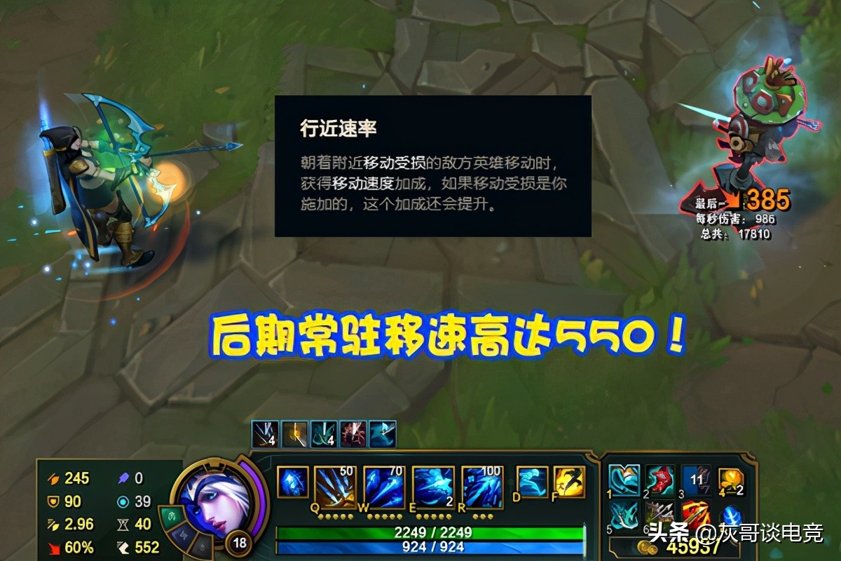 经过灰哥的测试,六神装艾希搭配行近速率,触发破败之后移速可以瞬间突破610,常驻移速差不多在550左右,再加上寒冰箭可以不停的减速对手,完美诠释了何为“极致拉扯”,近战英雄不交闪现基本别想摸到她。