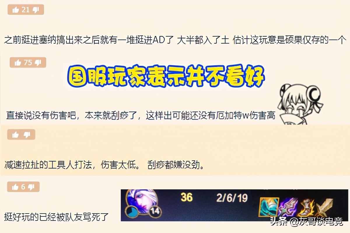 很快这套新出装就传到了国服,一时间引起了不小的争议,不少玩家表示:“艾希出挺进破坏者是什么奇葩理解?本来伤害就刮痧,这么出装根本就是没有伤害了吧。”另外还有玩家晒出了自己的战绩截图,并调侃道:“挺好玩的,就是被队友骂得半死。”看得出来大多数人对艾希出挺进破坏者都持怀疑态度,不过既然韩服高分局这么多人使用,那么肯定就有它的道理,接下来灰哥就简单给大家分析一下这套新出装的优缺点。