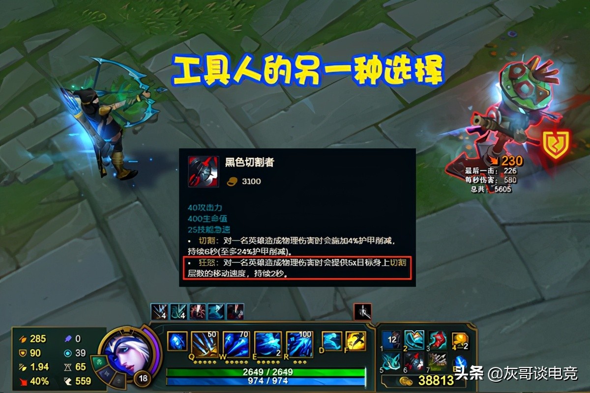 另外如果你想当一个更加纯粹的工具人的话,灰哥建议可以把第四件装备换成黑切,这件装备不仅可以为艾希提供高额移速,同时还能提升她的坦度、加快技能CD、让W技能附带AOE破甲效果,并且后期伤害也和出飓风差不多。