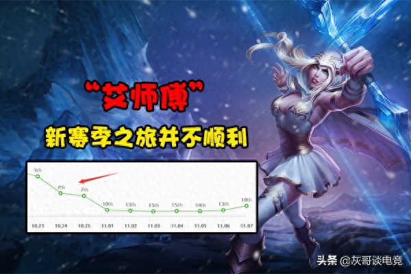 各位英雄联盟玩家们大家好,我是灰哥,今天要跟大家聊一聊召唤师峡谷中著名的“刮痧师傅”寒冰射手艾希。在上个赛季中,艾希还是比赛与路人局中的常客,但进入S11赛季之后,艾希在下路的处境就变得非常挣扎,根据数据显示,从10.23季前赛版本开始,她的登场率几乎是一路下滑。