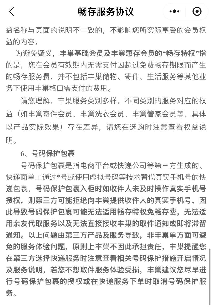 记者查询发现,丰巢在《畅存服务协议》中确有“号码保护包裹”的相关取件费用规定:如收件人未及时操作真实手机号授权,则第三方可能拒绝向丰巢提供收件人的真实手机号,可能导致无法适用畅存特权免畅存费,无法适用亲友代取服务以及无法直接接受丰巢的取件通知或即将滞留通知……