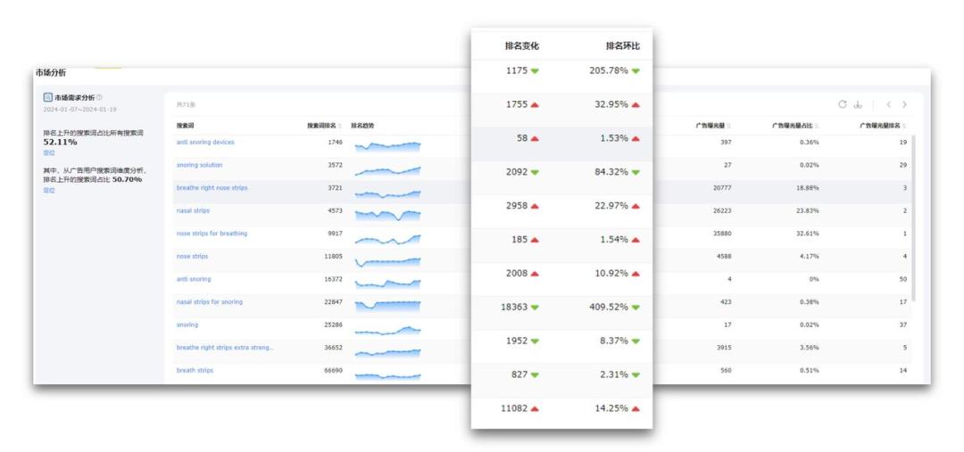 一款产品会对应多个流量词,一个个去找,会花费大量的时间,赛狐ERP【销量洞察】已经帮卖家整合了所有流量词的ABA排名波动,可以帮助卖家快速抓住市场的需求变化。