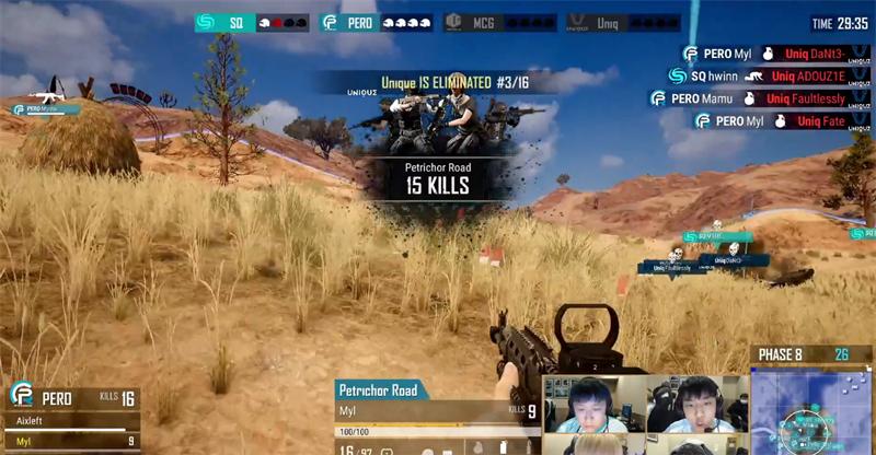 决赛圈马云龙作为一支奇兵埋在圈中心的位置,其他三人赶着SQ和UNIQ打架,随着蓝区到来SQ被迫开车扎进UNIQ的位置,双方互有损伤,埋在近点的马云龙先把SQ开车的人打掉,然后向废车区疯狂扔雷,一波交战过后只剩下SQ一人,随后一声怒吼PeRo四打一成功晋级,完成终极剧本杀,前三周其他队伍累死累活,不如PeRo一把翻盘,这局比赛打完之后观众感受胜利的喜悦迟迟不能平复。