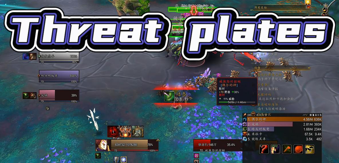 第3个插件,threatplates,大名顶顶的姓名板插件,能让你在眼花缭乱的AOE过程中看清楚怪的血量和仇恨,红色血条的时候就是自己是仇恨是危险的,绿色血条就是安全状态,同时在血条上还可以显示怪物身上的debuff和buff时间,着重会显示控制技能,pvp玩家的最爱,还会显示怪物施法条,如果你真的看不到不会打断,那你就把施法条调整到像我这么大,所有的东西都可以自定义,血条长度,宽度,buff大小等等。