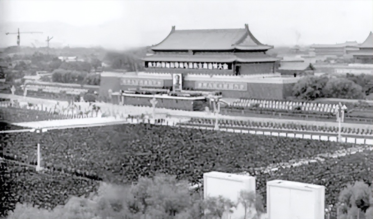 天安门广场庄严肃穆,横贯天安门城楼黑底白字横幅上写着:“伟大的领袖和导师毛泽东主席追悼大会”,七米高的毛主席巨幅遗像竖立在城楼的红墙中央。