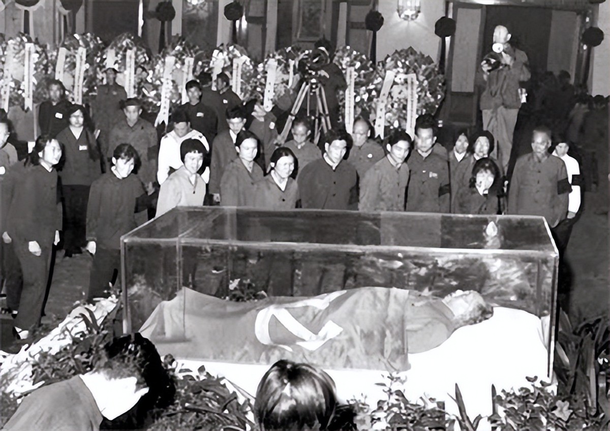 在军乐队奏起的悲壮的哀乐声中,以华国锋为首的全体政治局委员,从福建厅走出来,每人都戴着黑纱,面容悲伤,低头缓步进入北大厅。