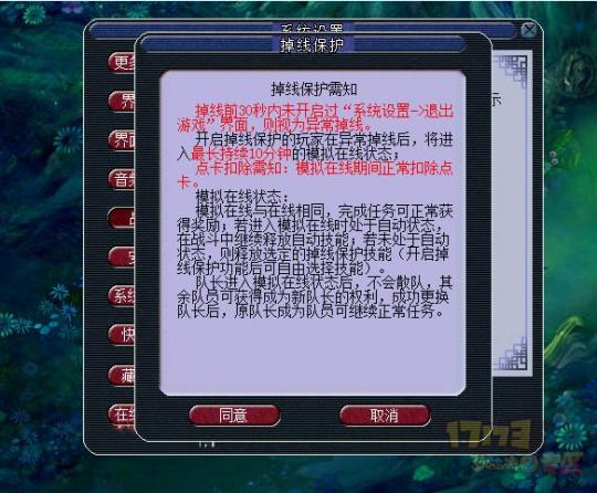 这个掉线保护的说明写的略长,我给大家简单的解释一下。就是如果你不是主动自己关闭游戏引发的离线,系统就会判定为掉线,这个时候你还会保持在线状态10分钟,如果这时候是跟队状态,会自动帮你放技能,如果这时候是队长,会把队长身份交给其他玩家。