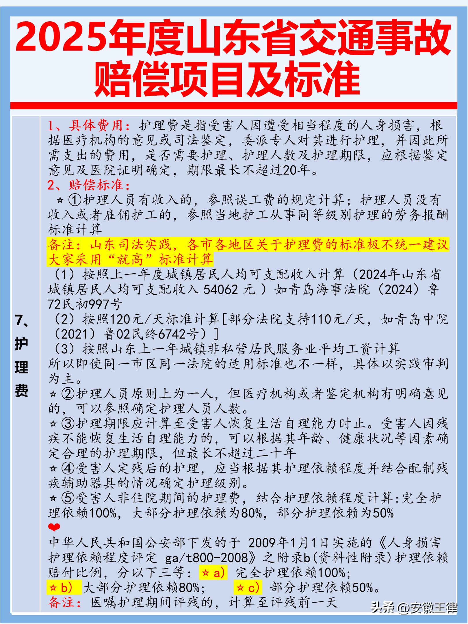 ⭐①护理人员有收入的,参照误工费的规定计算;护理人员没有收入或者雇佣护工的,参照当地护工从事同等级别护理的劳务报酬标准计算备注:山东司法实践,各市各地区关于护理费的标准极不统一建议大家采用“就高”标准计算(1)按照上一年度城镇居民人均可支配收入计算(2024年山东省城镇居民人均可支配收入 54062 元 )如青岛海事法院(2024)鲁72民初997号(2)按照120元/天标准计算[部分法院支持110元/天,如青岛中院(2021)鲁02民终6742号)](3)按照山东上一年城镇非私营居民服务业平均工资计算所以即使同一市区同一法院的适用标准也不一样,具体以实践审判为主。