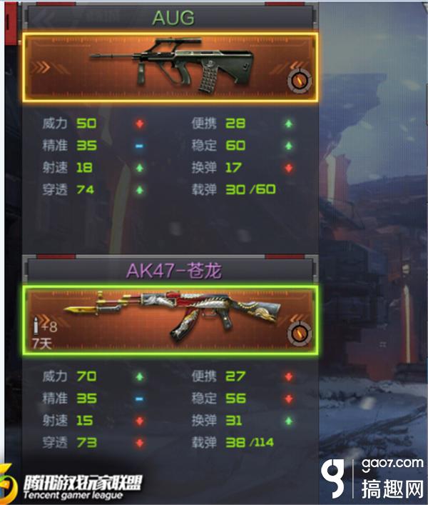 AUG对比AK47-苍龙,在威力上欠佳一些外,射速、穿透数据都领先这把AK步枪,而且由于AUG开枪声音非常小,所以成为广大玩家的最爱是毋庸置疑的。
