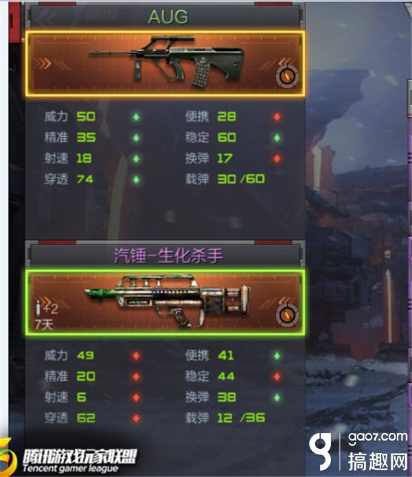 AUG对比汽锤,虽然不是一个风格,但是AUG在威力、精准、射速等数据方面明显高于紫装品质的汽锤-生化杀手。而且由于AUG是一款普通品质的枪械就已经有这样均匀的数据,可见升级版是有多么的强悍。