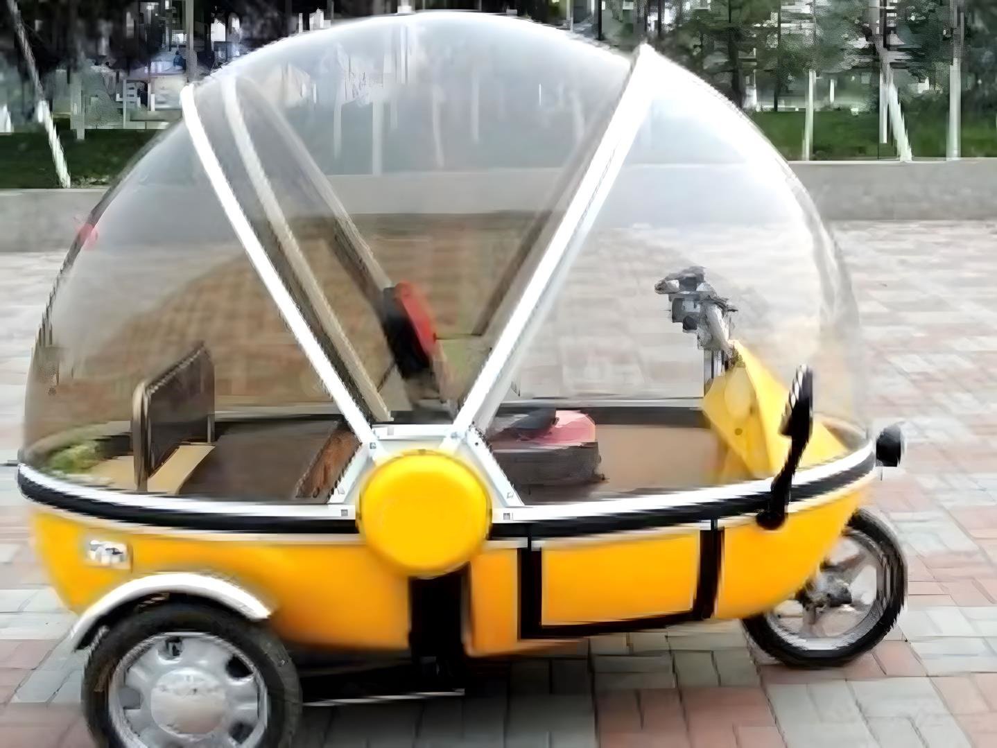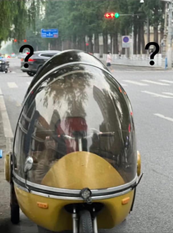 这种“三轮车”,小鱼干并没有在现实中见过,但这个设计不得不说确实有点魔幻,全包围玻璃罩的结构,像个透明玻璃球一样,这应该是为了遮风挡雨。