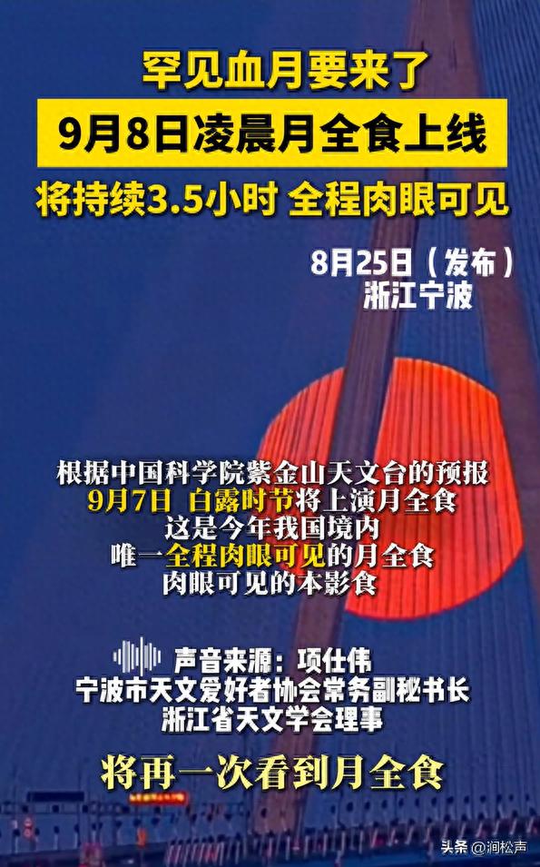 据中国科学院紫金山天文台的预报,9月7日,白露那天将会上演月全食,这是今年我国境内唯一可以全程肉眼观看的月全食,也就是说只要当天你们当地气象条件良好,都是可以清晰的看到这一壮丽的天文奇观的。
