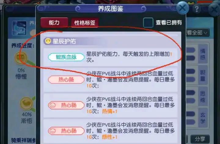 那么如何培养才能获得这两个性格呢?遗憾的是,官方并没有任何文档说明,结合吧友的讨论,我最终的结论是完全随机,甚至获得周天法相的概率被官方调低了。既然性格我们无法人为操控,接下来我们来看标签,周天法相下有两个标签分别是鲲之大 鲲之微,对应了勇敢和内敛两个属性,星辰护佑下有一个鲲族血脉(加一次免死)标签,对应了理性属性,这3个标签都是我们需要的标签。
