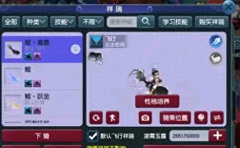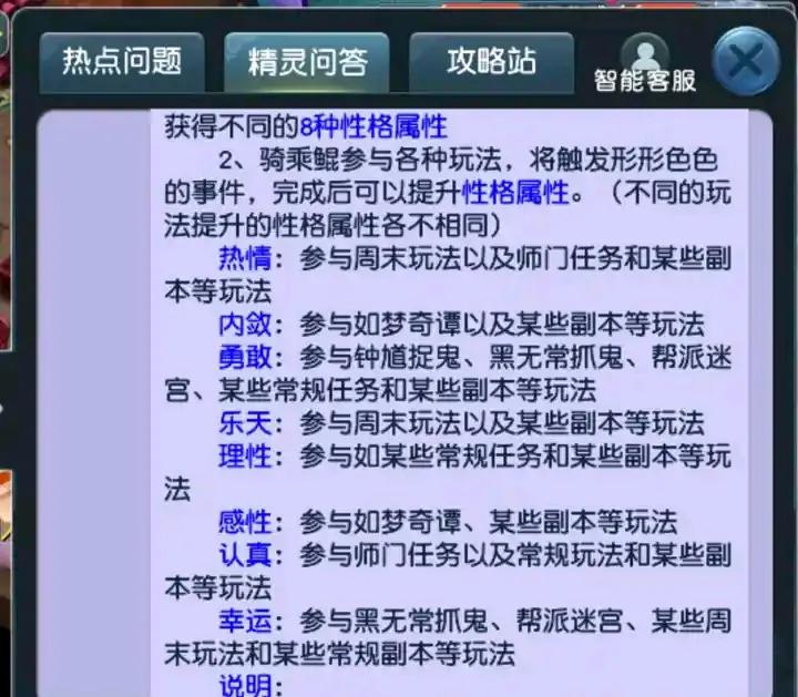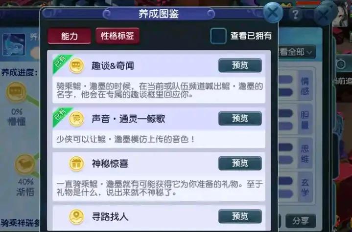 抽到鲲之后,需要对其进行培养,才能获得各种能力,变大变小送礼免死等等。开启培养之后,需要骑乘它参与各种获得经验或金钱的活动,才能获得培养进度,进度到100%的时候算培养完成,除了参与活动还有一种是通过奇闻与鲲对话获得培养进度。