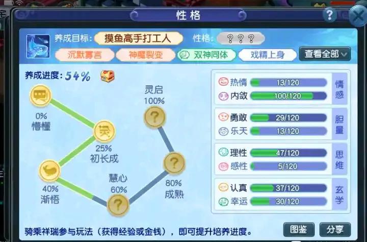 了解了性格和性格下的标签后我们来看培养的目标,从性格下手,我们只需关注40%阶段与80%阶段的性格,40%目标是获得周天法相性格,这样才有机会解锁鲲之大与鲲之微两个标签,80%目标是神秘惊喜性格,才能领礼物。