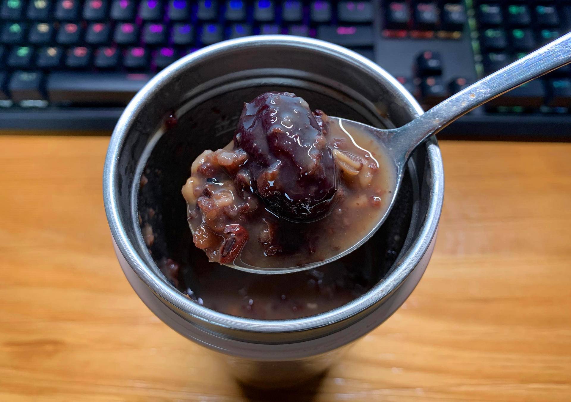 ▲除了能烧水之外,我平时也用它来焖烧一些代餐粥,家里烧的红豆+大枣养生粥从冰箱里取出倒入便携烧水壶内,带去公司加热就能喝上热腾腾的粥