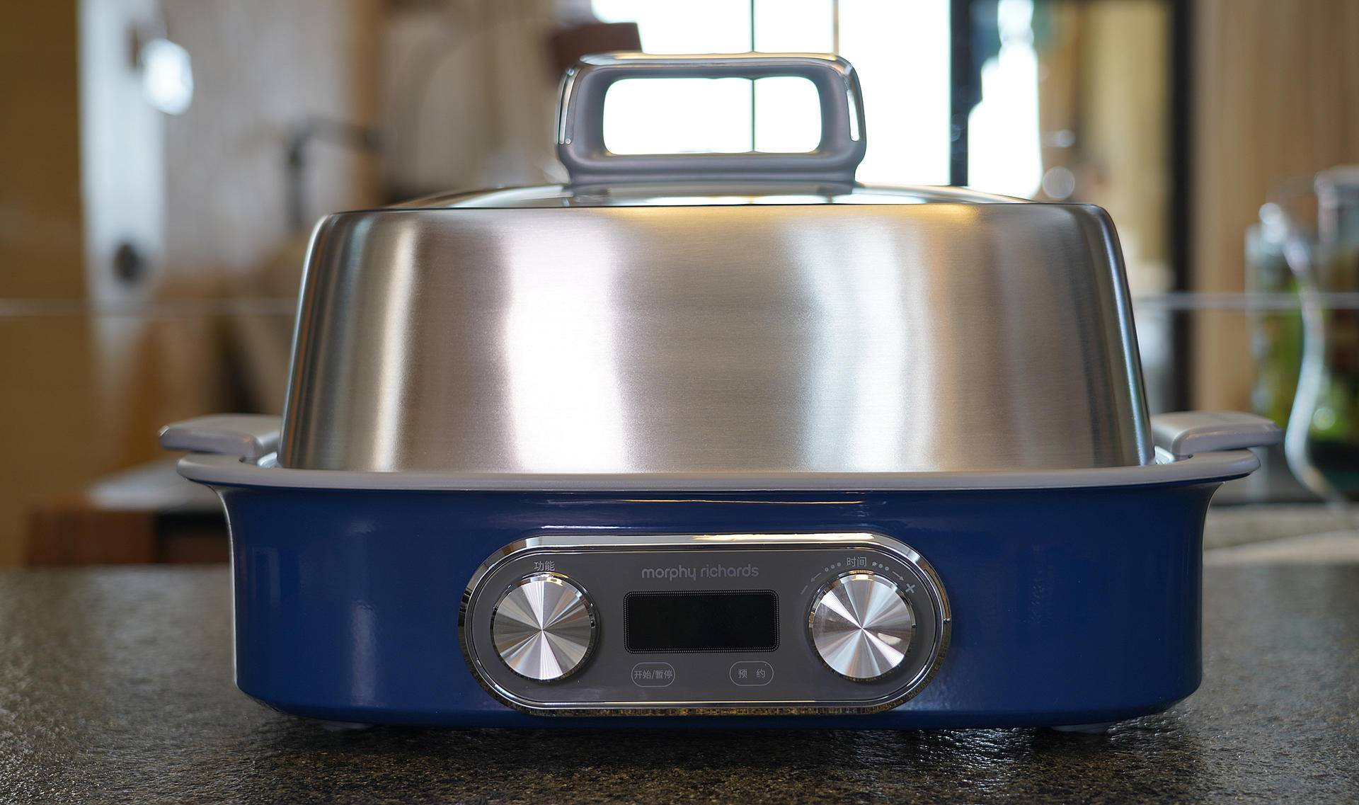 ▲主机颜色蓝色,配合不锈钢拉丝银的锅盖,摩飞极速蒸炖锅颜值在线