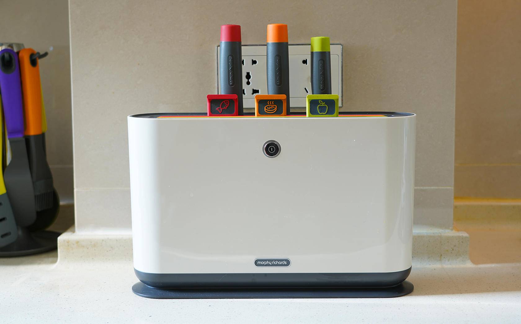 ▲机身还自带锂电池,内置的深紫外线杀菌UVC LED能对刀和砧板杀菌