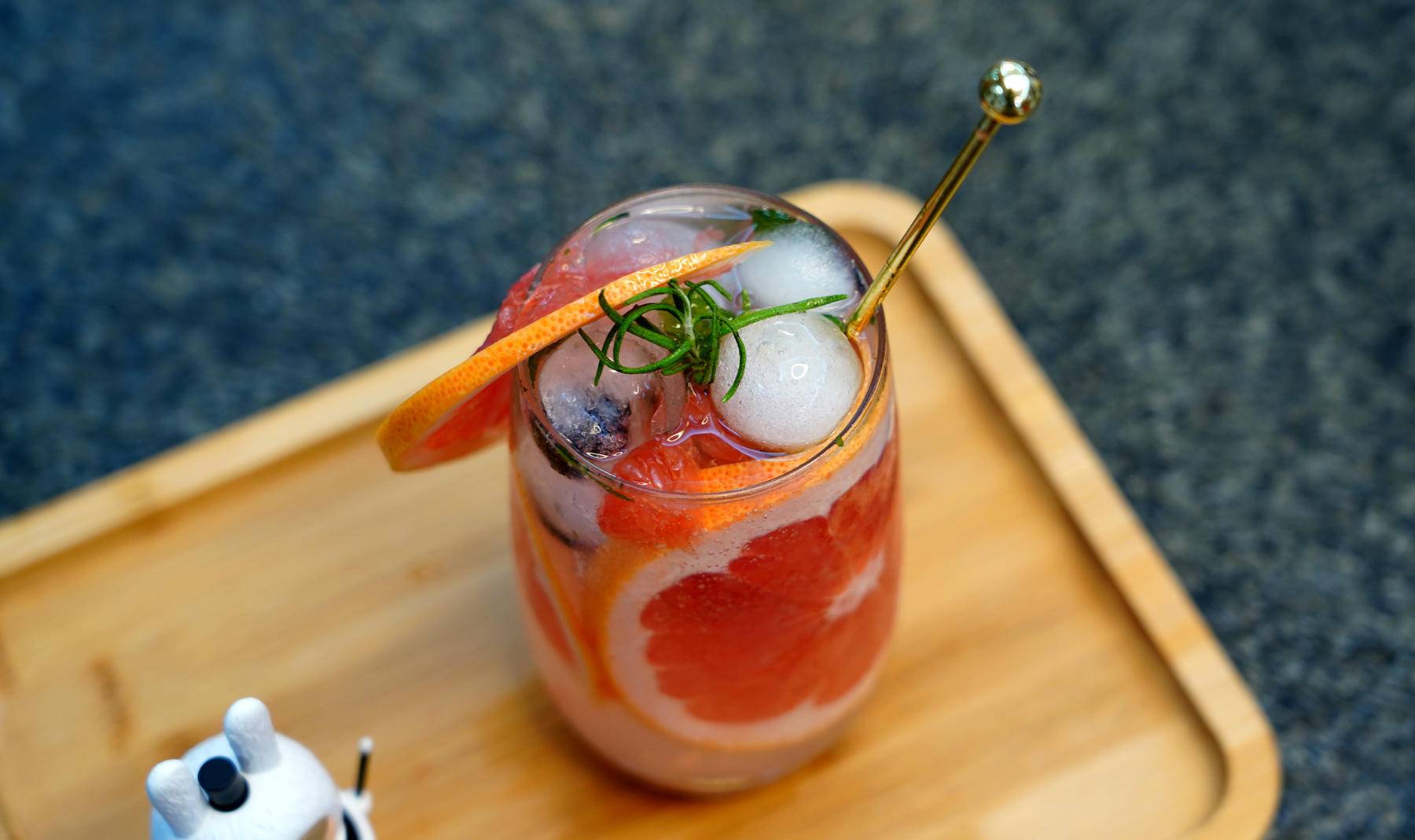 ▲需用到的原料有西柚汁、 苏打水、西柚一个、冰球诺干