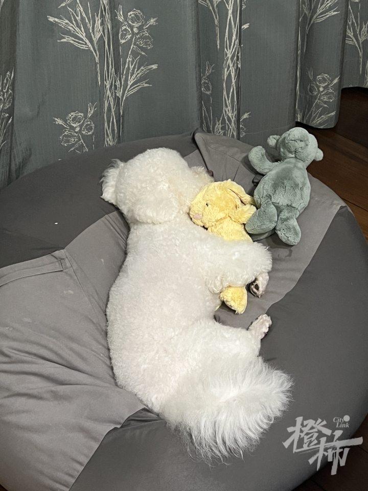 搂着自己心爱公仔睡觉的比熊宝贝。