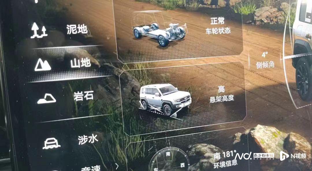 在经过野外路况时,在屏幕左边选择岩石、泥地、山地等模式,悬架高度均会从“标准”自动调节成“高”。例如,使用岩石模式,后锁会自动开启,能量中锁也会在轮胎出现打滑或悬空的情况下,自动将动力转移至附着力强或着地的轮胎上,帮助车辆更好地完成脱困。至于越野一旦遭遇飞坡跌落等紧急情况,由于有云辇-P的加持,理论上可以有效减少50%的冲击载荷。最直观的驾驶体验,就是通过高低落差较大的路面时,车身俯仰角度、弹跳感均得到更有效的抑制。而正是具备高低可调的液压悬架主动调节能力,使舒适性明显增加,大大减少了传统越野产品“以硬碰硬”的感受。