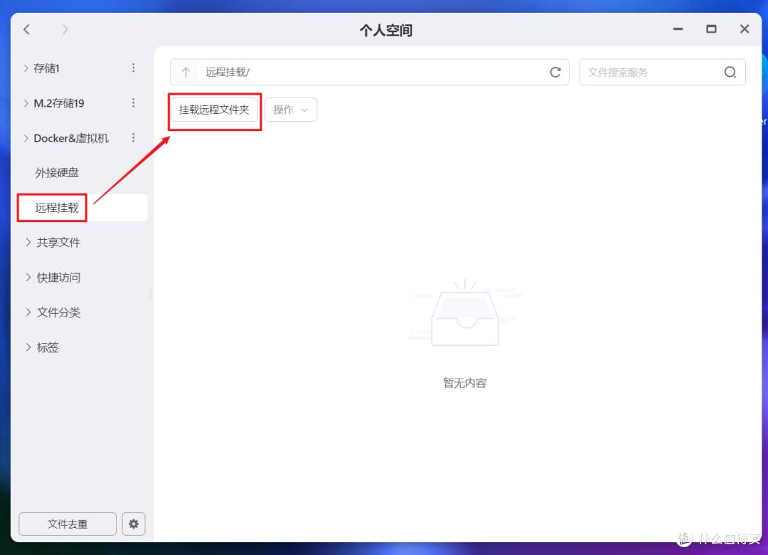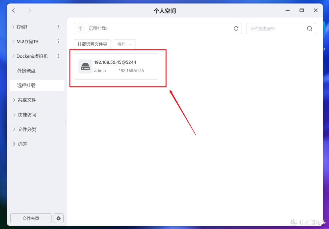 接着来到极空间这边,打开个人空间,选择“远程挂载--挂载远程文件夹”。