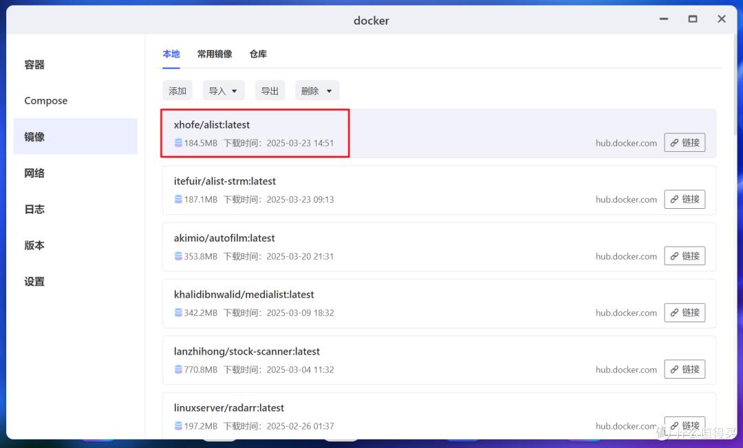 然后在极空间的Docker镜像仓库中搜索并下载镜像“xhofe/alist”。