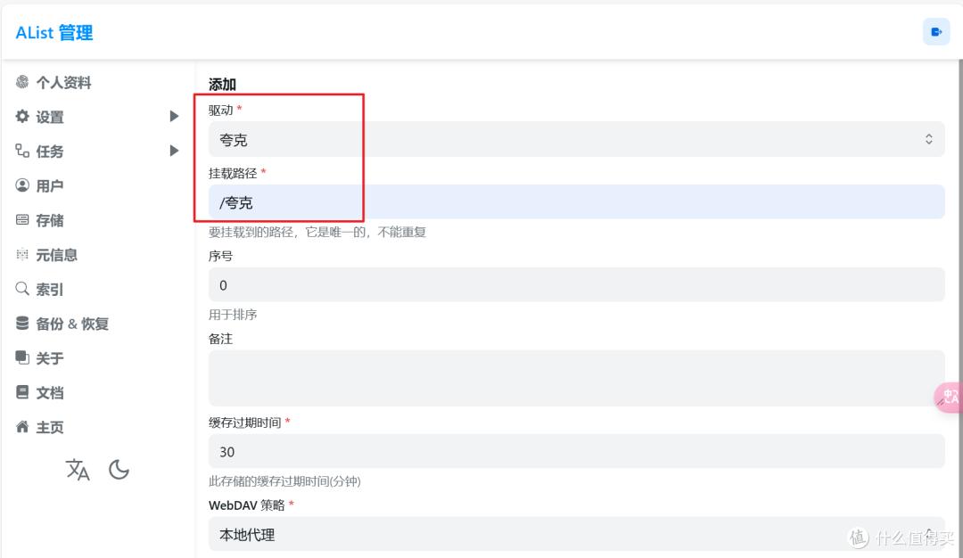 驱动选择“夸克”,挂载路径输入“/夸克”。