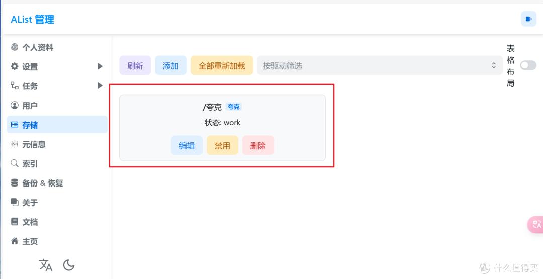 回到存储这里,如果看到刚挂载的夸克网盘显示的状态为“work”,就说明挂载成功。