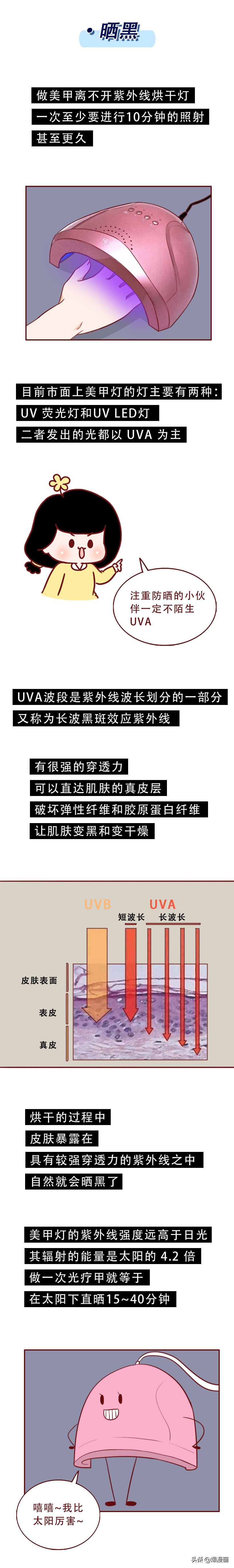 ·晒黑风险:在没有做好预防措施的情况下,手指皮肤可能会因紫外线烘干灯而变黑。