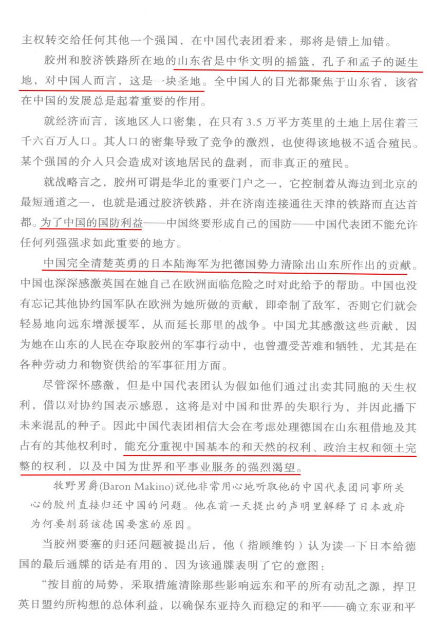 尊敬的主席阁下,尊敬的各位代表:我很高兴能代表中国参加这次和会。我自感责任重大,因为我是代表了占世界人口四分之一的中国在这里发言。刚才牧野先生说中国是未出一兵一卒的战胜国,这是无视最起码的事实。请看(出示照片),战争期间,中国派往欧洲的劳工就达十四万,他们遍布战场的各个角落,他们和所有战胜国的军人一样在流血、牺牲。我请大家再看一张在法国战场上牺牲的华工墓地照片(出示照片),这样的墓地在法国在欧洲就有十几座,他们大多来自中国的山东省!他们为了什么?就是为了赢得这场战争,换回自己家园的和平和安宁。因此,中国代表团深信:会议在讨论中国山东省的问题的时候,会考虑到中国的基本合法权益,也就是主权和领土完整,否则亚洲将有无数的灵魂哭泣,世界也不会得到安宁!