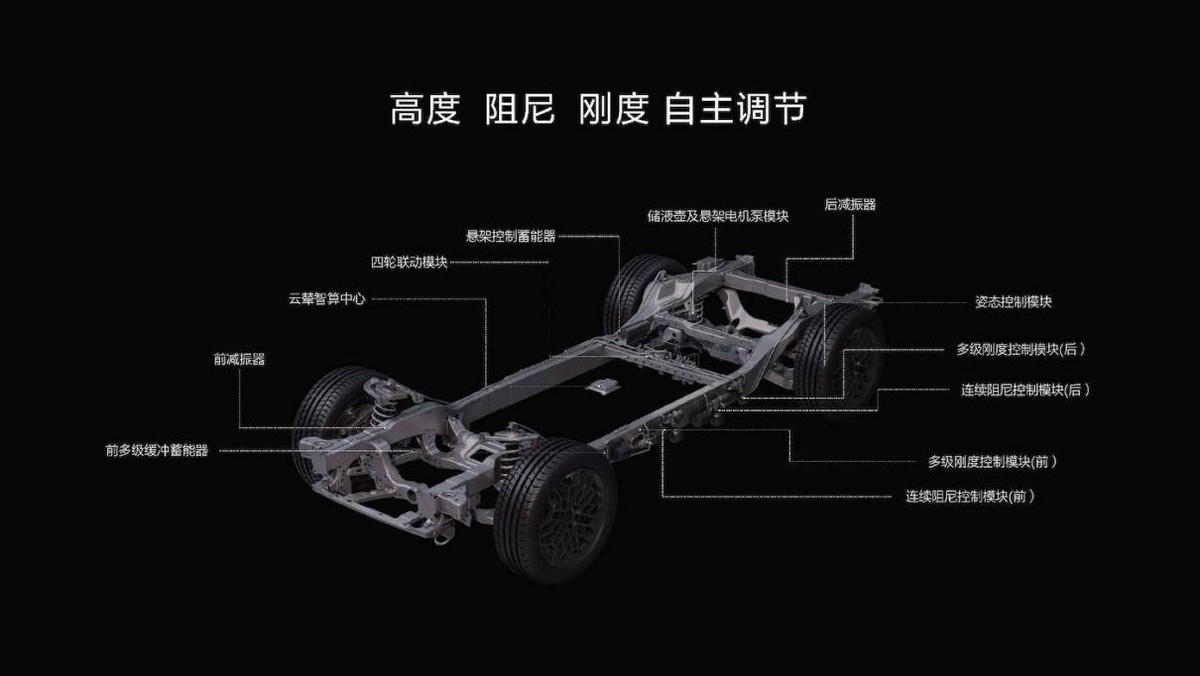 车辆预计还是会采用非承载式车体结构+前后独立悬架的组合方式,双叉臂式独立悬架不光会在大梁协助下保障刚性,更能在云辇-P智能液压车身控制系统的帮助下,带来公路行驶的稳定舒适,也把全地形的适应能力做得更极致。(下图为仰望U8搭载的云辇-P系统示意图)