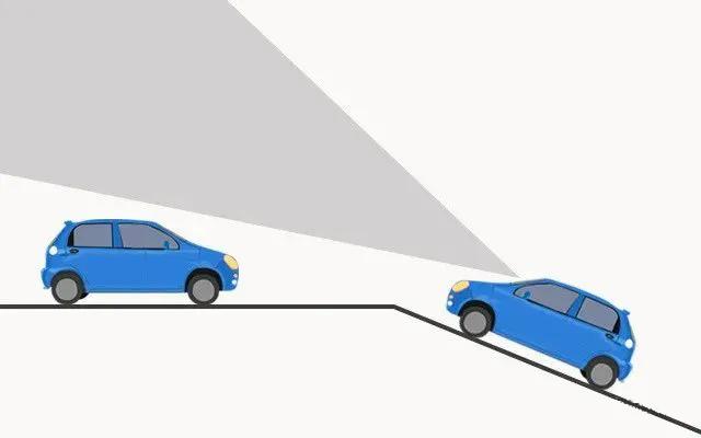 车辆在上坡时,会与坡面形成夹角,出现视野盲区,可能无法发现对向车辆及坡道上的其他障碍物。坡上的车辆在下坡时,也可能遇到此类情况。