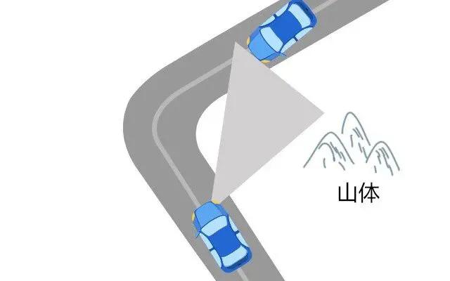 车辆在山区经过弯道时,内侧山体可能阻挡视野,对向来车也可能遇到此类情况。