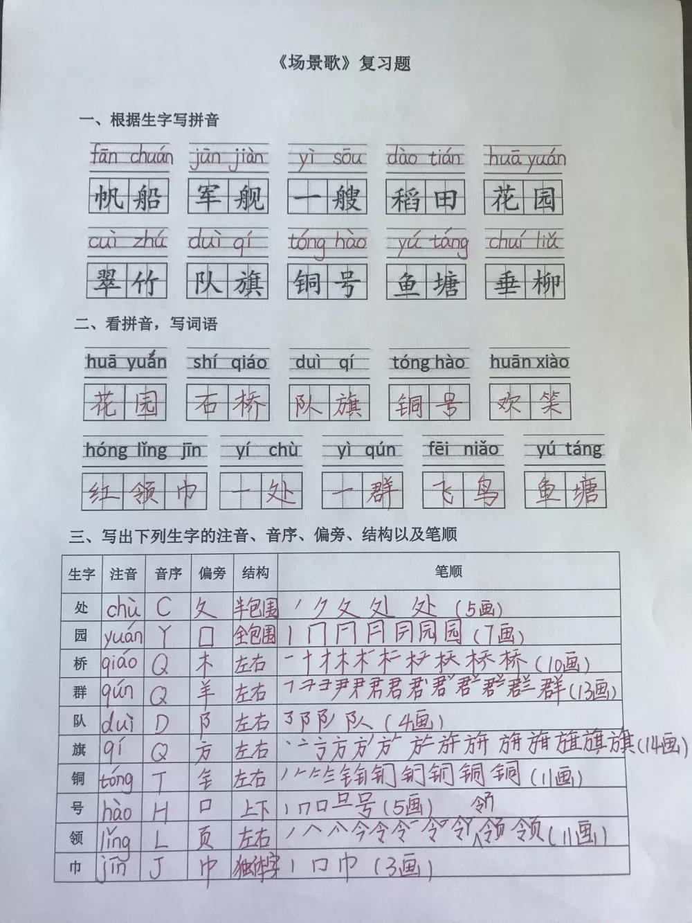 ②生字表:要求会写并可以写出生字的笔顺、会组两个以上词语,熟练掌握生字的部首、结构与音序,包括以下生字:处、园、桥、群、队、旗、铜、号、领、巾