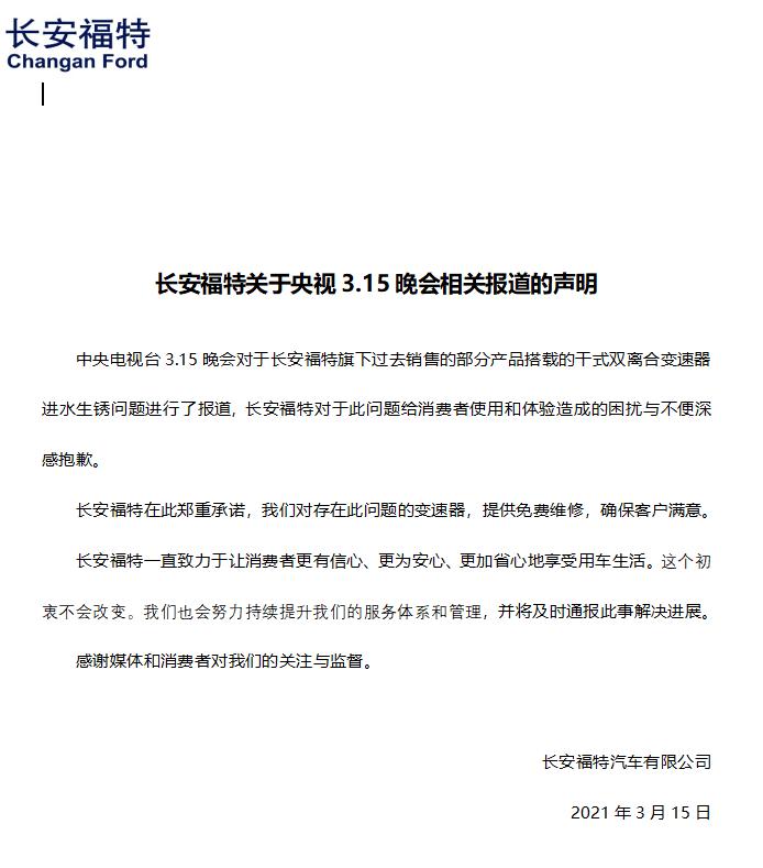 截至3月15日22:50分,长安福特就3·15晚会发布相关声明,承诺“对此次存在问题的变速箱,提供免费维修,确保客户满意。”