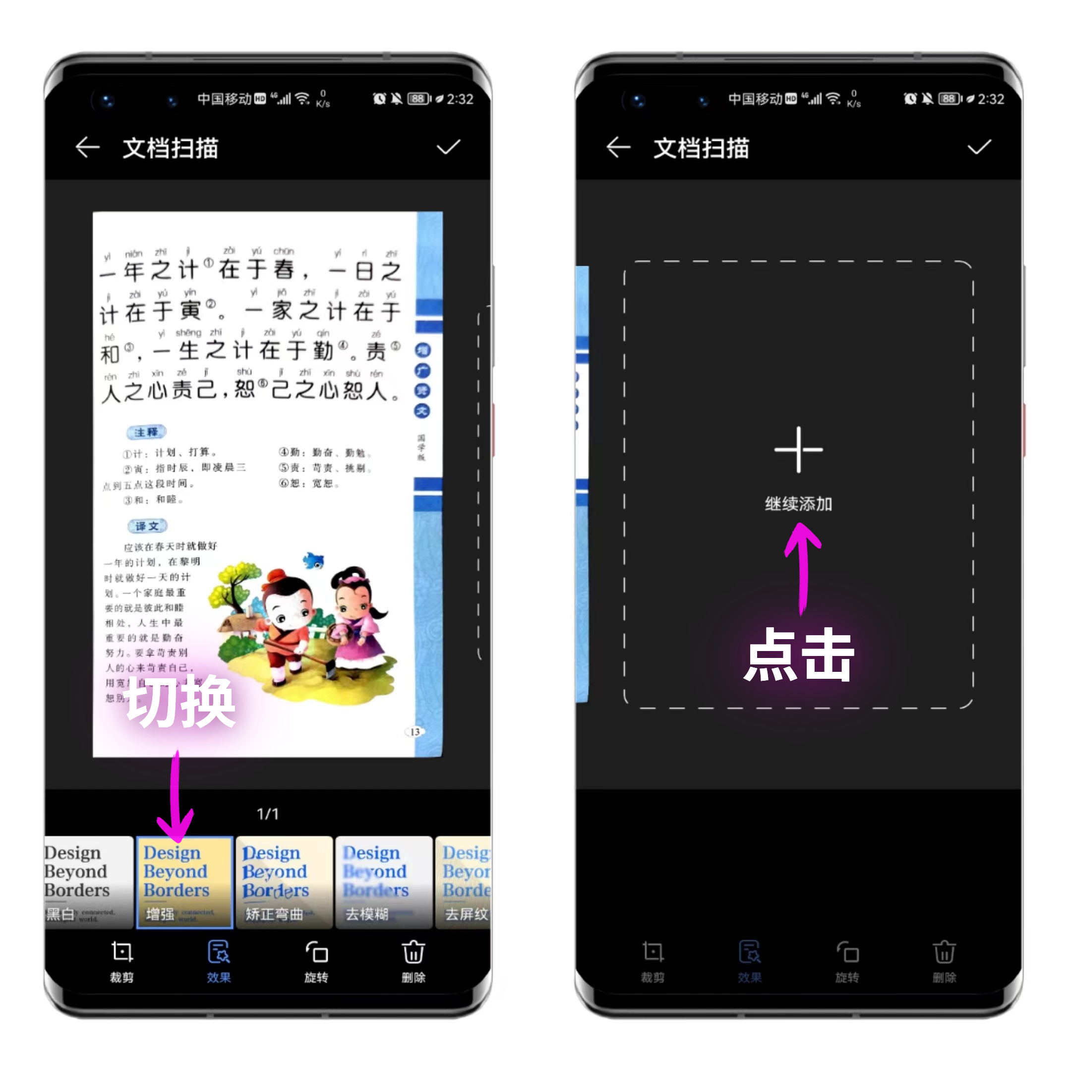 4.随后我们查看文档扫描效果,非常清晰!支持黑白效果,矫正纸张弯曲,还能消除模糊、消除屏纹,向右滑动屏幕,可以继续添加扫描文件。