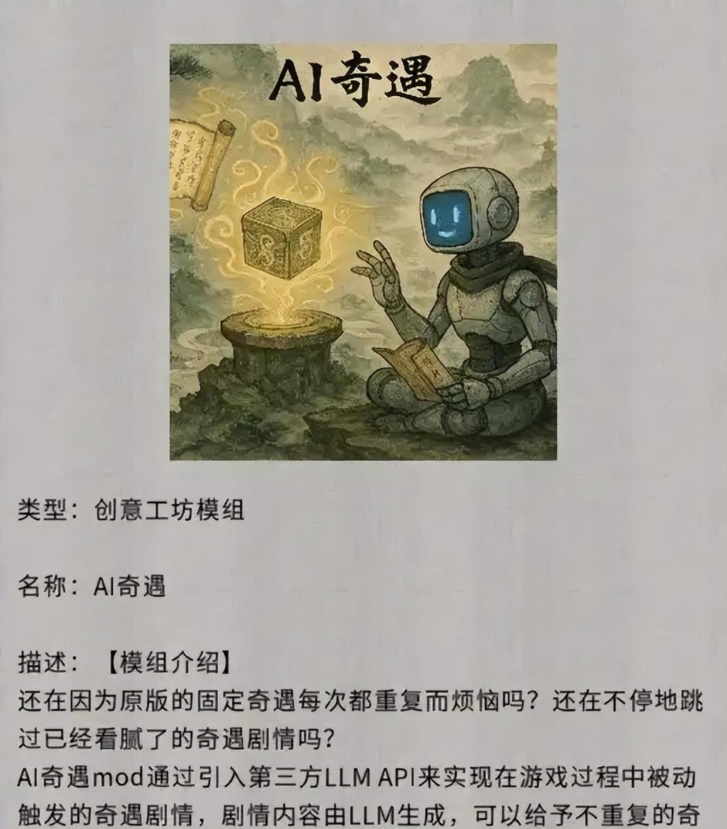 厌倦了原版千篇一律的奇遇?这款Mod通过AI实时生成独一无二的剧情,每次触发都会结合你的角色信息、NPC背景和游戏进度,带来完全随机的故事分支和奖励。可以搭配【神识传音】使用,从此你的每次奇遇都是全新冒险!