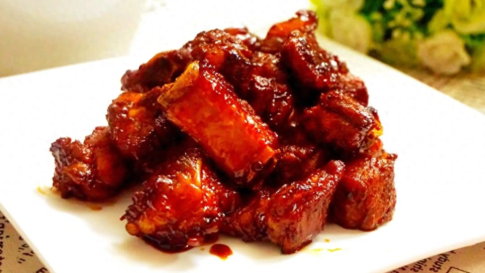 4.这道菜会用到酱油,记得千万别用老抽,烧出来的颜色会有很大变化,用一点生抽酱油增加一点酱香味的同时也不影响色泽。还有一点要特别注意,米醋不仅味道适宜,而且也不影响到菜色。最后这道菜的糖醋比例和传统冷吃做法糖多醋少的比例不同,热吃做法醋多糖少的比例为 1.5 比1,一斤半的排骨60克醋,40克白糖,盐的用量很少,大概 1 克盐就够了,再加30克生抽酱油,最后再调个水淀粉收汁。