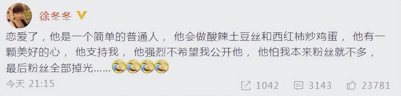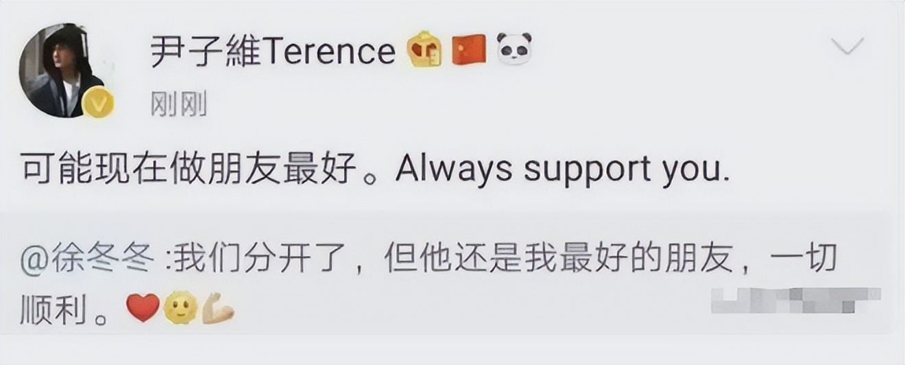 不过这都不重要,2019年8月徐冬冬就在微博说二人已分手,但还是好朋友。尹子维也转发说现在做朋友最好。