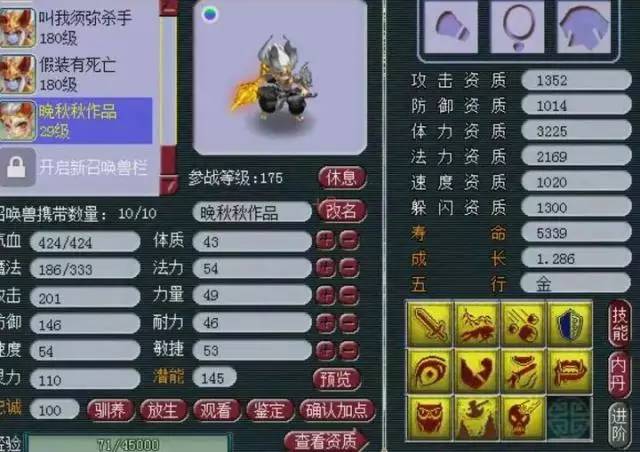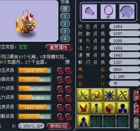 9技能毗舍童子:攻资1454,成长1.255!9技能死亡童子胚子,攻资跟成长不错,就是体资太低了,只有2299,帅编觉得这个宝宝要是打书过程中不掉死亡召唤的话,不论以后怎么加点,体资都是硬伤,需要吃几年体元宵才能养起来,如果死亡被打掉的话,可以选择做隐攻,因为它的速资为1442,完全符合隐攻的标准!