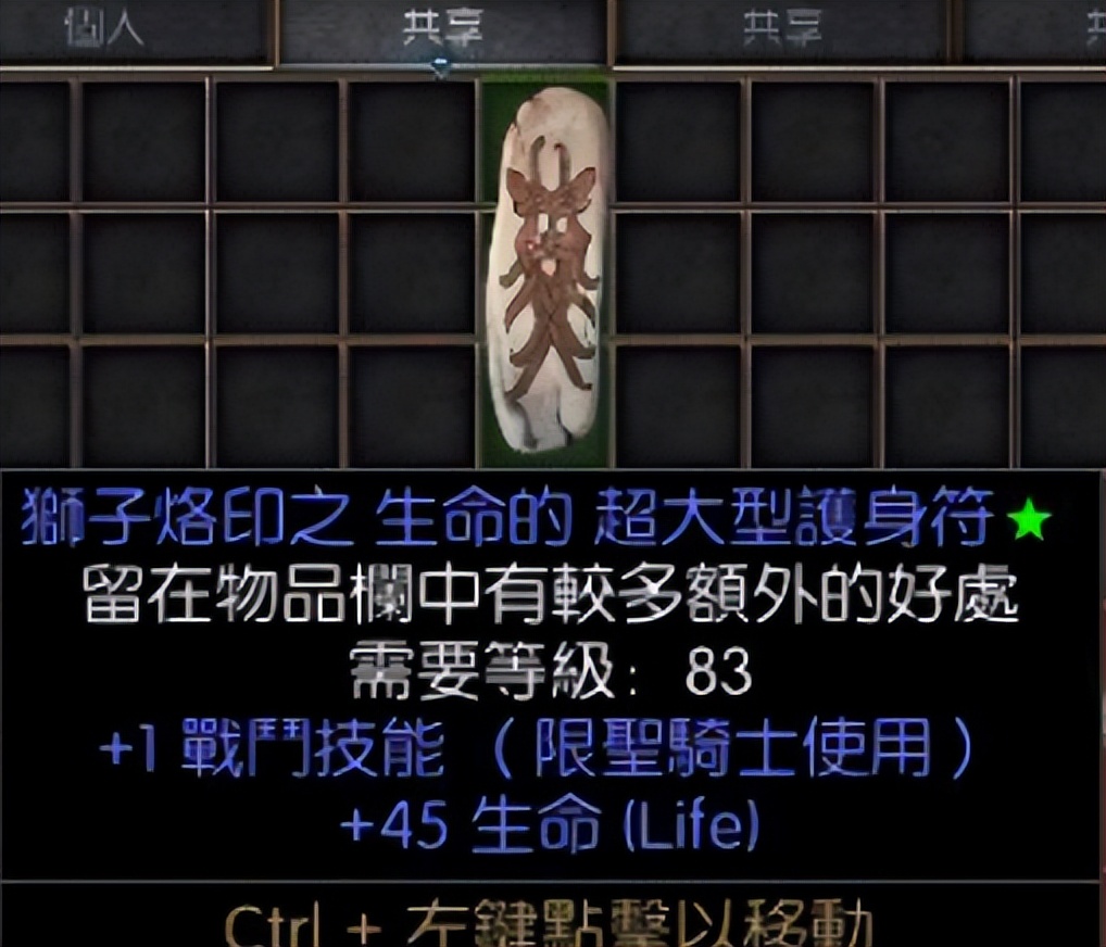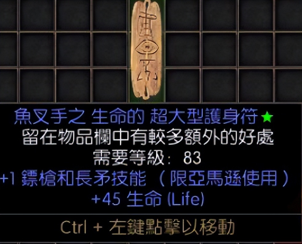 20法力,17生命的小型护身符。两条都是满变量,这件物品几乎是每个PK玩家必备的小护身符。这种满变的极品价格自然也不低,市场价大概在40元左右。
