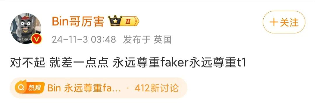 赛后,一向“嘴硬”的bin哥也被fake的发挥所折服,发微表示尊重faker。